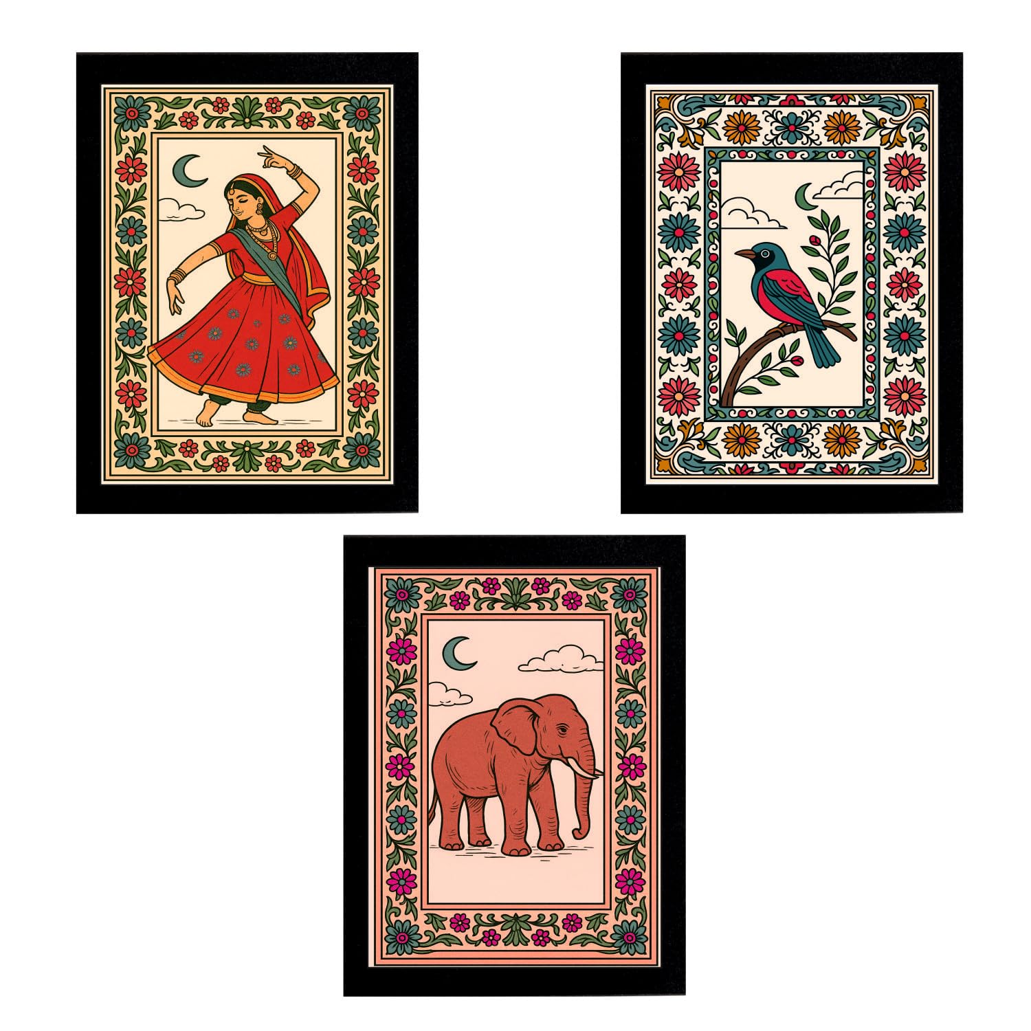 Bring home the charm of Indian tradition with this Traditional Indian Art Wall Frame Set of 3 featuring a Dancing Woman, Elephant, and Bird — each symbolizing grace, wisdom, and peace. Crafted with high-definition prints, rich colors, and a matte finish, these artworks capture the beauty of cultural heritage and artistic detail.